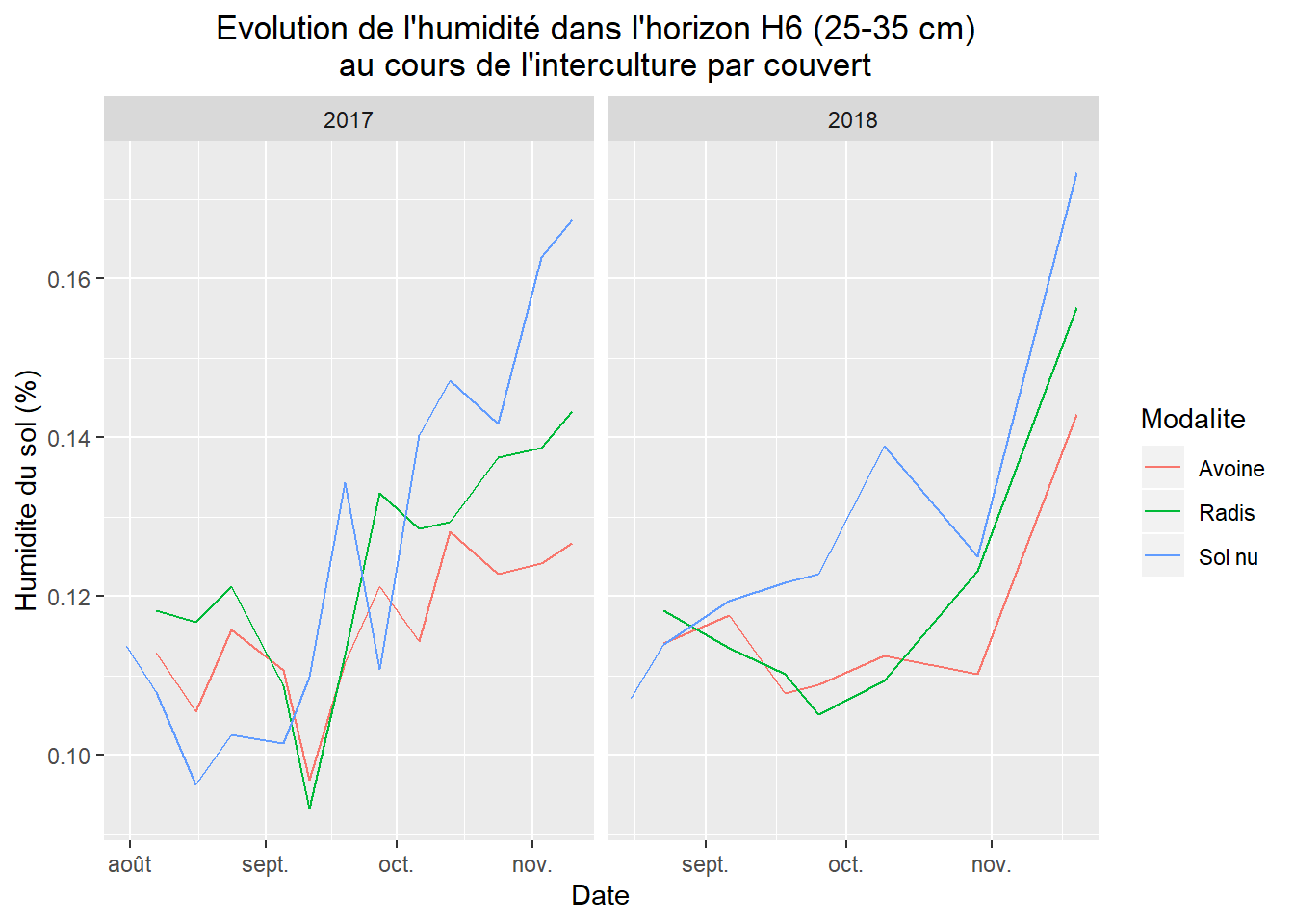 Pour les essais conduits en 2017 et 2018, l’horizon tassée (H6) se réhumecte au cours l’interculture. Au semis de la culture intermédiaire, pour les deux années, l’humidité est proche de l’humidité au point de flétrissement permanent. En novembre, le sol est significativement plus sec en profondeur (H6 : 25-35 cm) sous les modalités couvertes. Le couvert a consommé une partie de l’eau pour croître. Toutefois, juste après le semis lorsque leur développement est limité, les couverts semblent favoriser la conservation de l’eau, surtout en 2017, où le sol est plus sec sous la modalité sol nu jusqu’à la mi septembre. Leur consommation d’eau est plus faible que l’effet de la couverture du sol. Lorsque les couverts commencent à croître et consommer plus d’eau (septembre-octobre), ils provoquent un assèchement du sol en profondeur. Finalement dès le mois d’octobre, les précipitations exédentaires, provoquent le rechargement du sol quelque soit la modalité.
