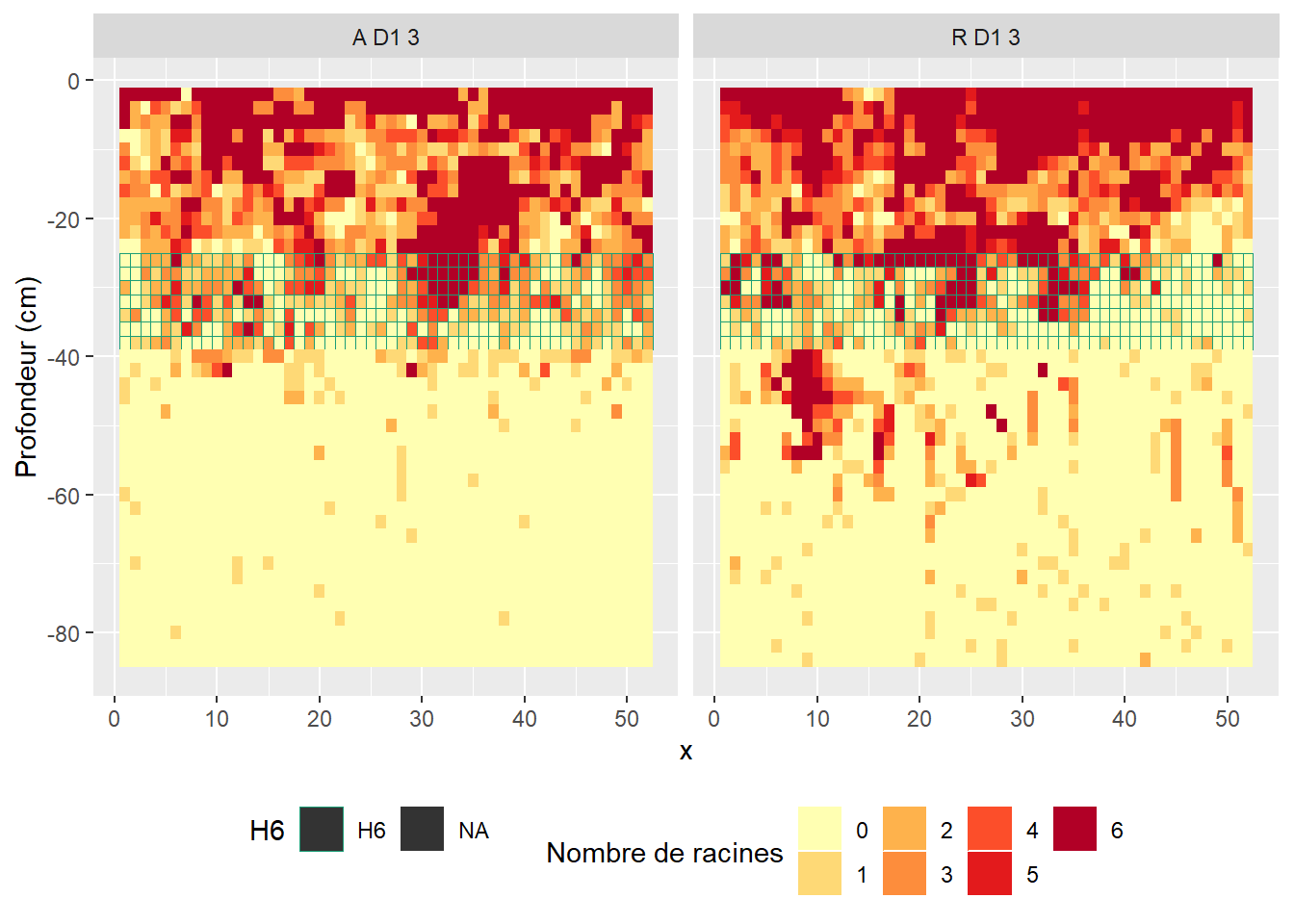 En comparant la réduction du nombre de racine (avant et après H6 tassé) et les observations faites sur l’état structural du H6, on observe qu’en 2017 la présence de bloc limite la traversée des racines alors que celle des fissures leur est plutôt favorable. Ainsi même si les couverts peuvent traverser les zones tassées celles-ci ont un impact sur leur enracinement.