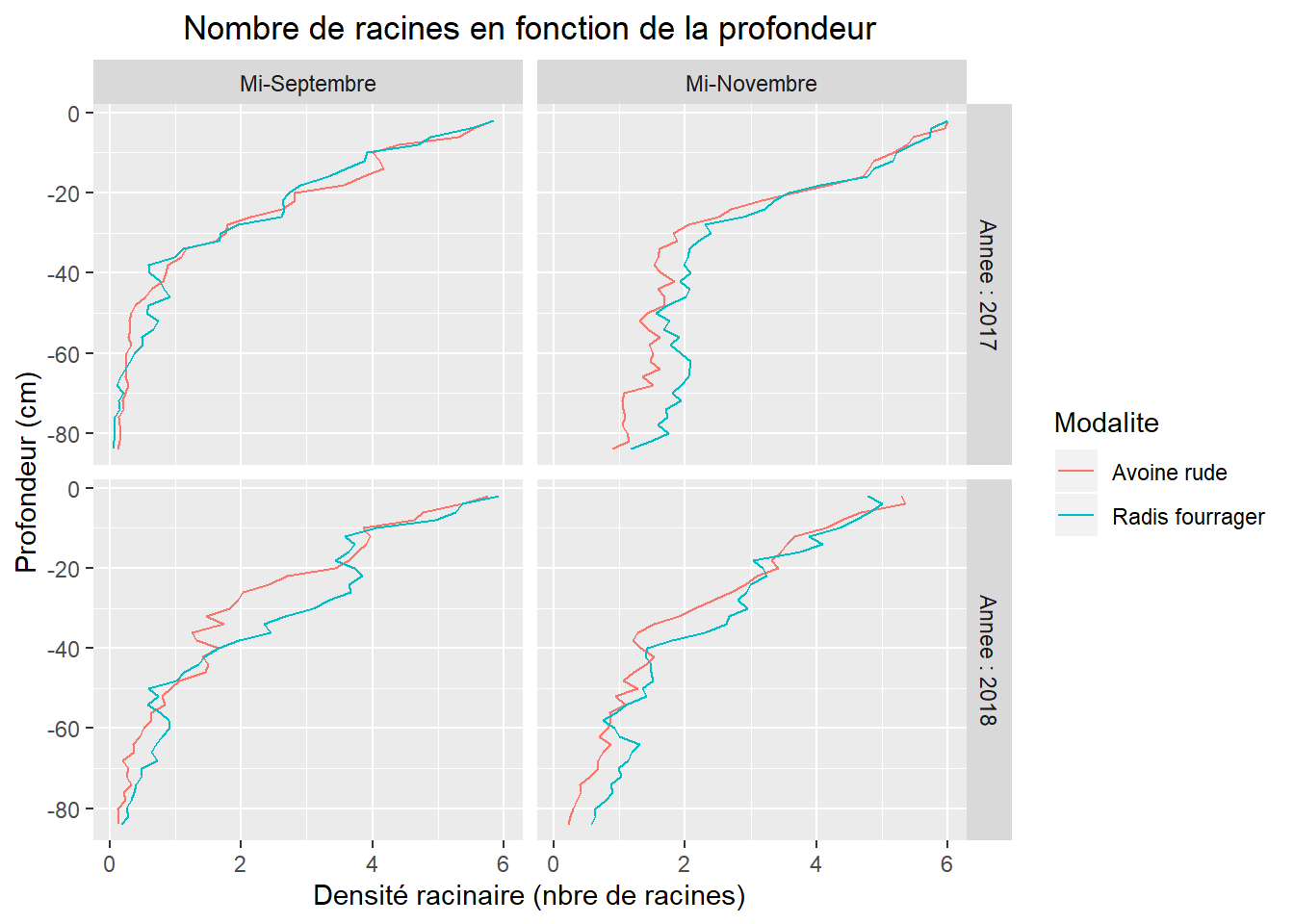 La figure précédente présente l’enracinement des cultures intermédiaires (nombre moyen de racines par case) en fonction de la profondeur. Contrairement à ce qui est couramment admis, l’avoine (système racinaire fasciculé) et le radis (pivotant) ont la même profondeur maximale d’enracinement. De plus, les courbes de densité racinaire en fonction de la profondeur des deux espèces présentent la même allure. Elles s’écartent néanmoins l’une de l’autre à une profondeur comprise entre 20 et 40 cm correspondant à l’horizon identifié comme tassé.